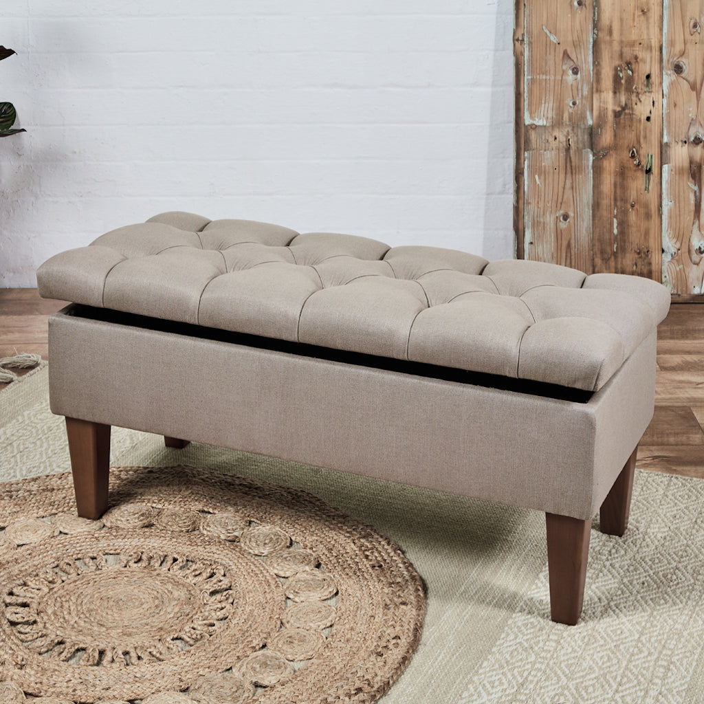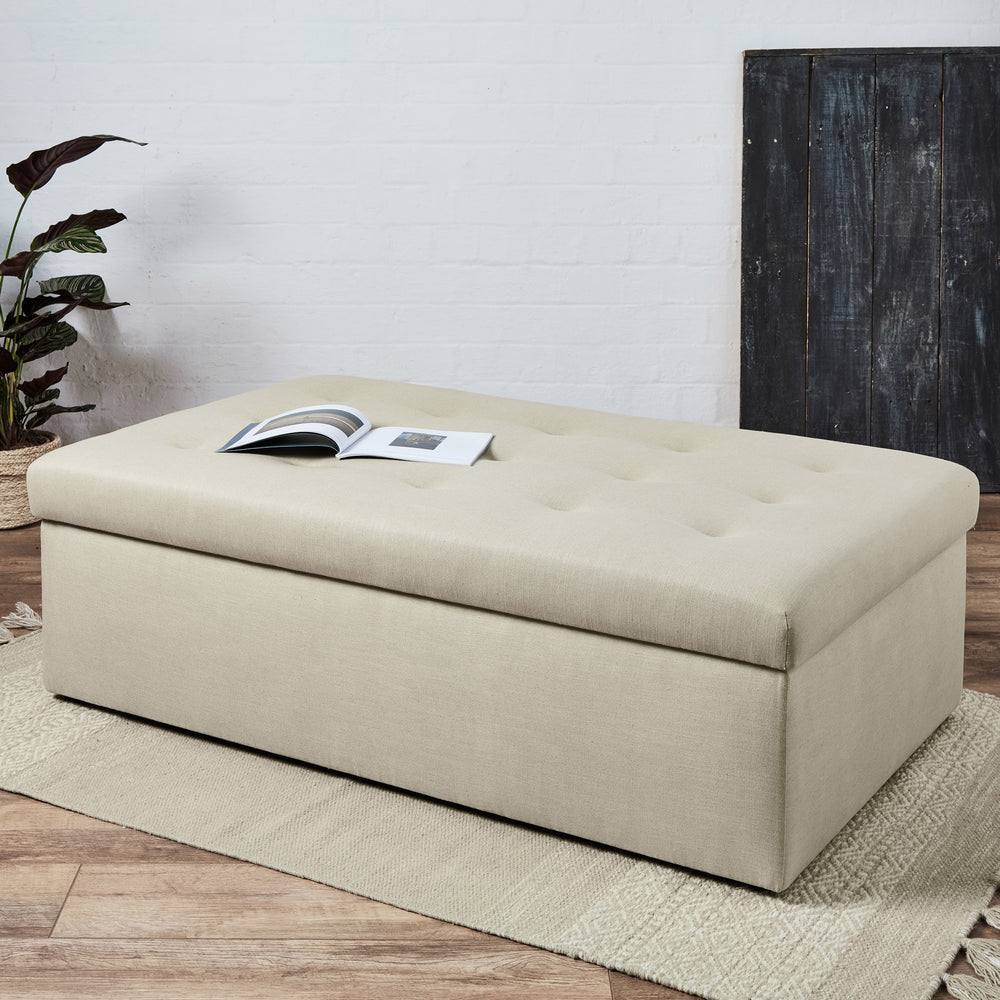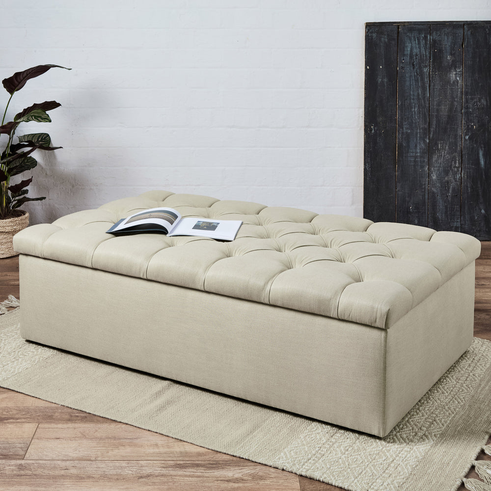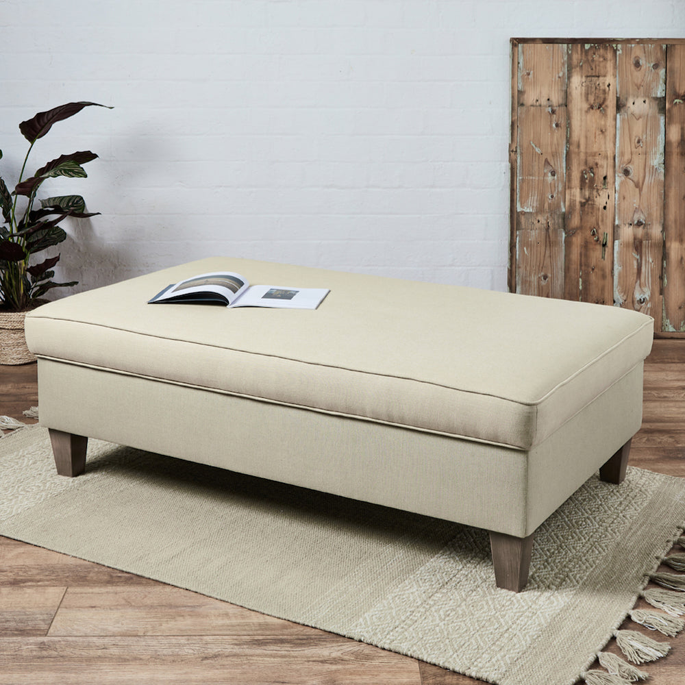 Storage Ottomans are generally larger than standard footstools so can be a very versatile piece of furniture to have in your home. Big, chunky and comfortable, Storage Ottomans can make great extra seating, or 'emergency seating' for when guests come over for dinner, to watch sport, a BBQ or the big Christmas party. That's why we ensure all our Ottomans and Storage Ottomans are extremely strong and can happily take the weight of several merry adults. The linings for our ottomans are a matt velvet in Cream or Grey and look really smart. Then when all the fun is over and it's time to relax, an Ottoman is perfect to put those feet up, and there's plenty of room for two. A large fabric Ottoman, or a leather storage ottoman can look great in any living room, bedroom, conservatory, games room, or kitchen!